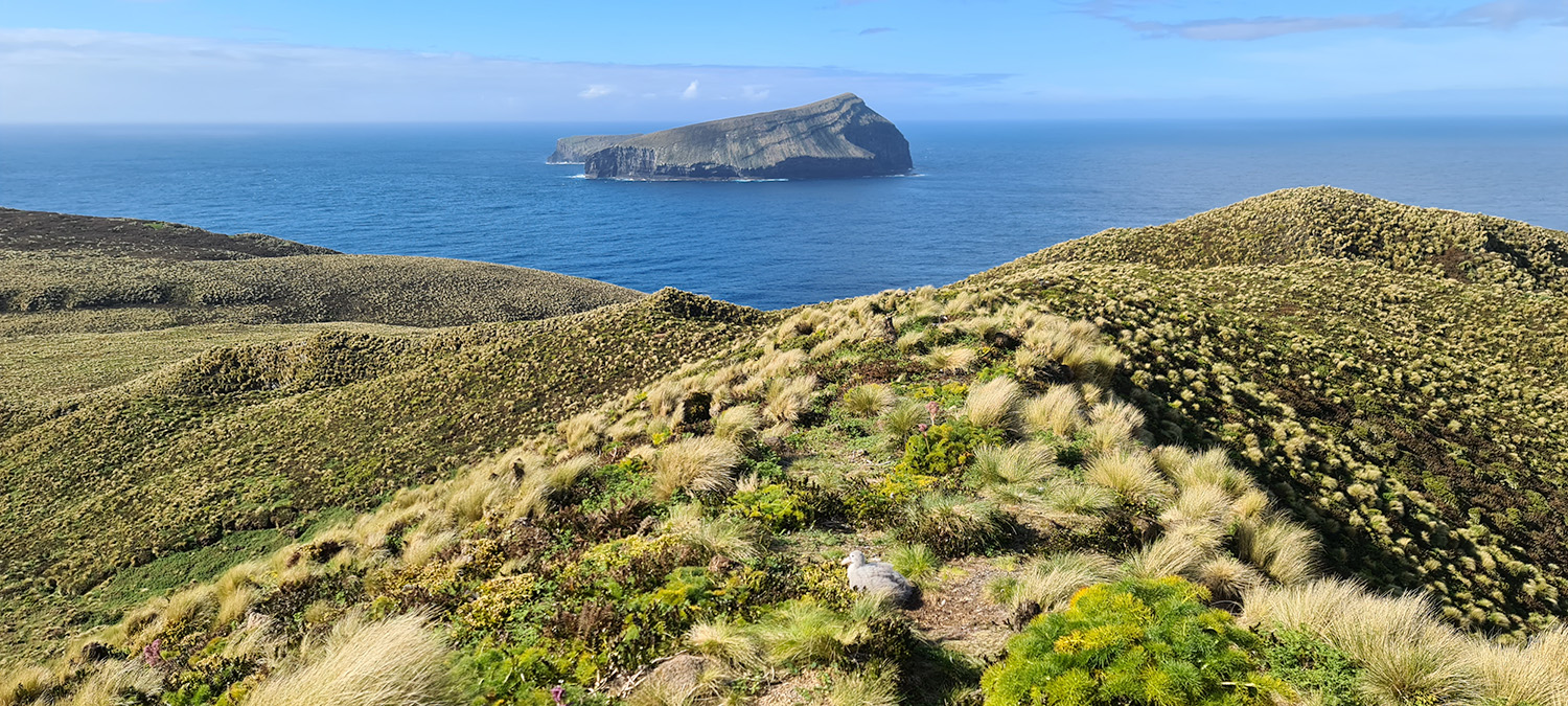 Smallish Erect-crested penguin colonies with a few individual Rockhopper nests on the fringes. Spotted Dougall Stream waterfall.