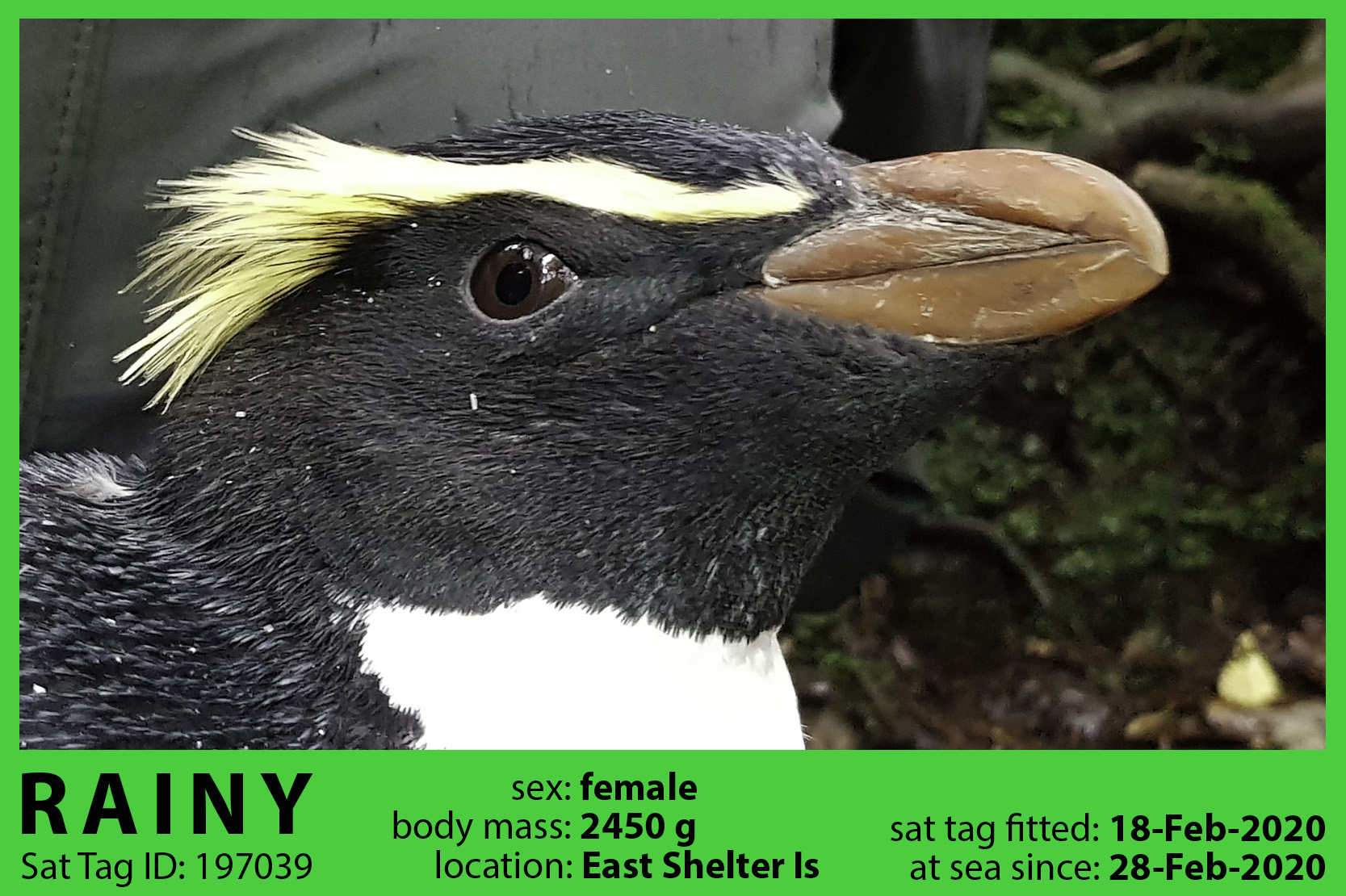 The last tawaki to be fitted with a satellite tag on East Shelter Is, and therefore, the last of our ‘normal’ moulters, is a lovely female that occupied one of the two caves at Richard’s honey pot site. Like most other females, she was a calm and cooperative bird that under any other circumstances would have provided the team with a relaxed deployment experience.