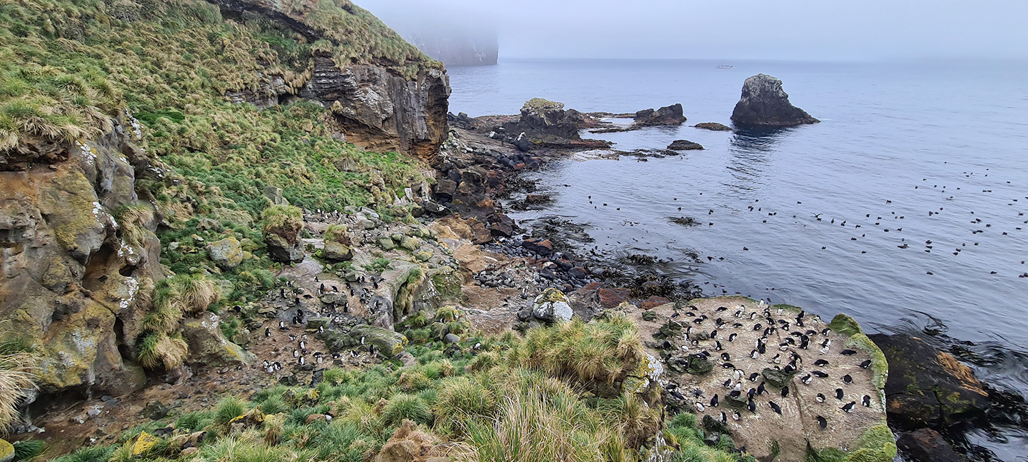 It is the final good bye as the Evohe weighs the anchor after lunch and disappears into the fog. We are on our own. In the late afternoon, we venture through the tussock towards Stella Bay. although just about 100m to the East of the hut, it takes us almost 30 minutes to get there. The chest deep tussock makes moving about truly challenging. in Stella Bay we are somewhat baffled by the low number of penguins breeding here. Instead of the 222+ nest that were here in 2014, we only see a bit over 60 nests. Not good.